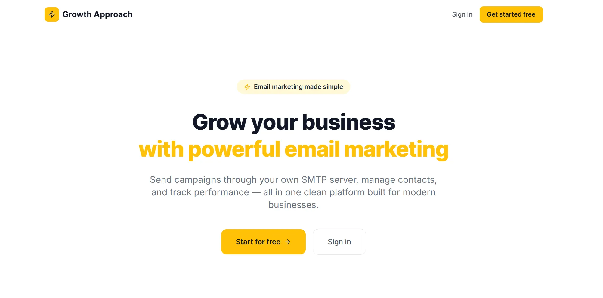 โ Email marketing platformGrowth Approach is an email marketing platform built for modern businesses who want full control over their campaigns. Send through your own SMTP server, manage contacts with tags and segments, and track real-time analytics โ all from a clean, intuitive dashboard.